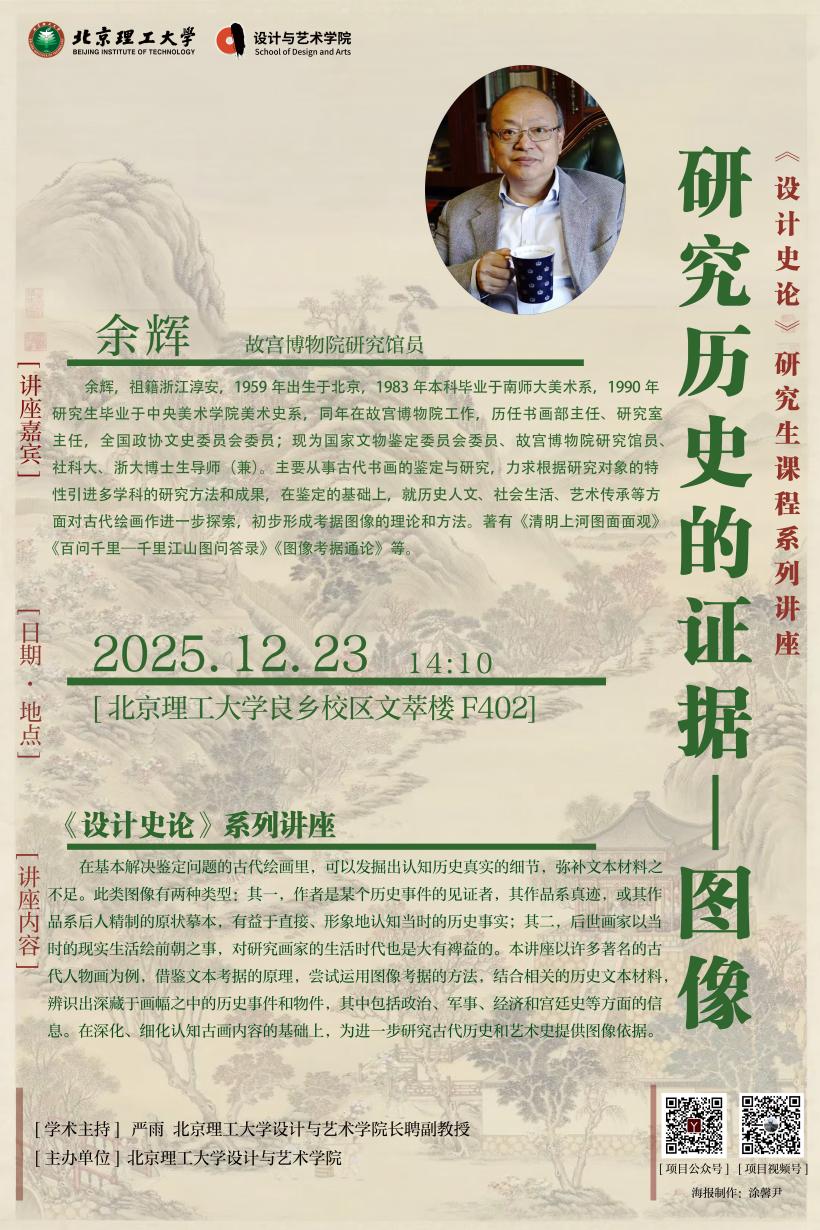 余辉:祖籍浙江淳安,1959年出生于北京,1983年本科毕业于南师大美术系,1990年研究生毕业于中央美术学院美术史系,同年在故宫博物院工作,历任书画部主任、研究室主任,全国政协文史委员会委员;现为国家文物鉴定委员会委员、故宫博物院研究馆员、社科大、浙大博士生导师(兼)。主要从事古代书画的鉴定与研究,力求根据研究对象的特性引进多学科的研究方法和成果,在鉴定的基础上,就历史人文、社会生活、艺术传承等方面对古代绘画作进一步探索,初步形成考据图像的理论和方法。著有《清明上河图面面观》《百问千里—千里江山图问答录》《图像考据通论》等。